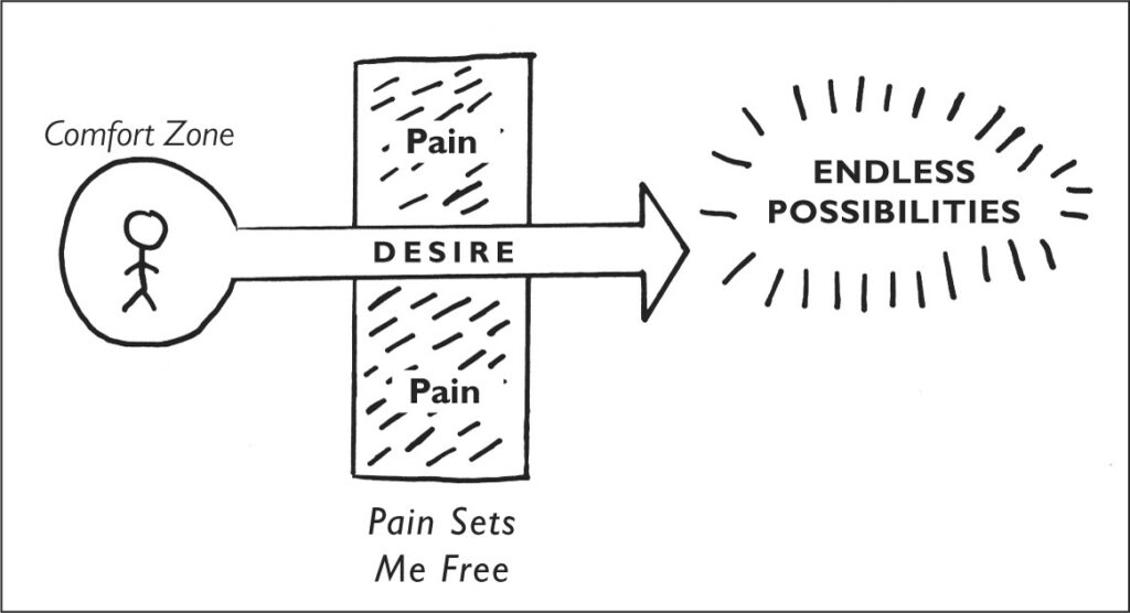 The key here is to make the pain as extreme as you can. What would it feel like if you got the very worst outcome? If you can master the worst, then anything less becomes easy. The more intense the pain—and the more aggressively you move into it—the more energy you’ll create.